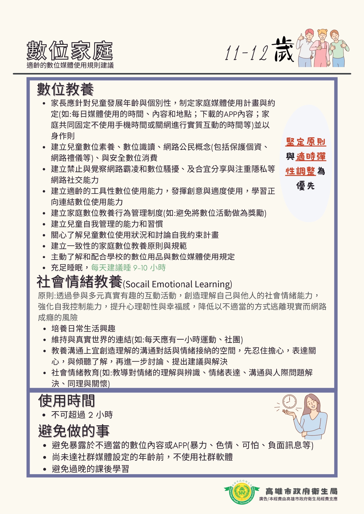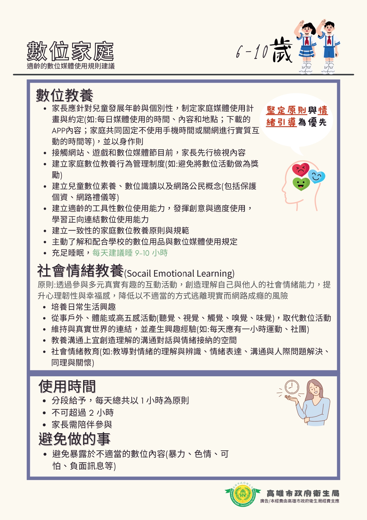 衛生局指出,數位教養須隨孩子的年齡與發展特質持續調整引導策略,整體而言0至2歲應避免接觸3C產品,以親子互動與語言刺激為主;3至6歲限制每日螢幕時間不宜超過1小時,照顧者應全程陪伴;國小學童可與家長共同討論訂定使用規則,每日娛樂性上網控制1.5至2小時內,輔以引導辨識網路風險;青春期青少年則以信任溝通為核心,協助建立媒體識讀與數位責任感,非學習用途的上網時間建議不超過2小時。