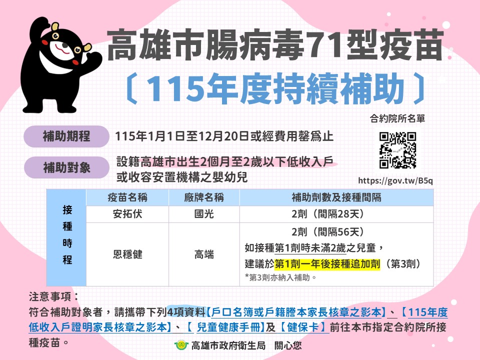 高雄市政府為守護嬰幼兒健康,期能降低傳染病重症風險以減輕弱勢家庭照護負擔,今(115)年延續全額補助弱勢嬰幼兒接種腸病毒71型疫苗及口服輪狀病度疫苗,即日起至今年12月20日(或經費用罄前),設籍高雄市符合補助接種對象的低收入戶、收容安置機構或原住民嬰幼兒,請家長攜帶指定文件安排指定合約醫療院所完成疫苗接種。