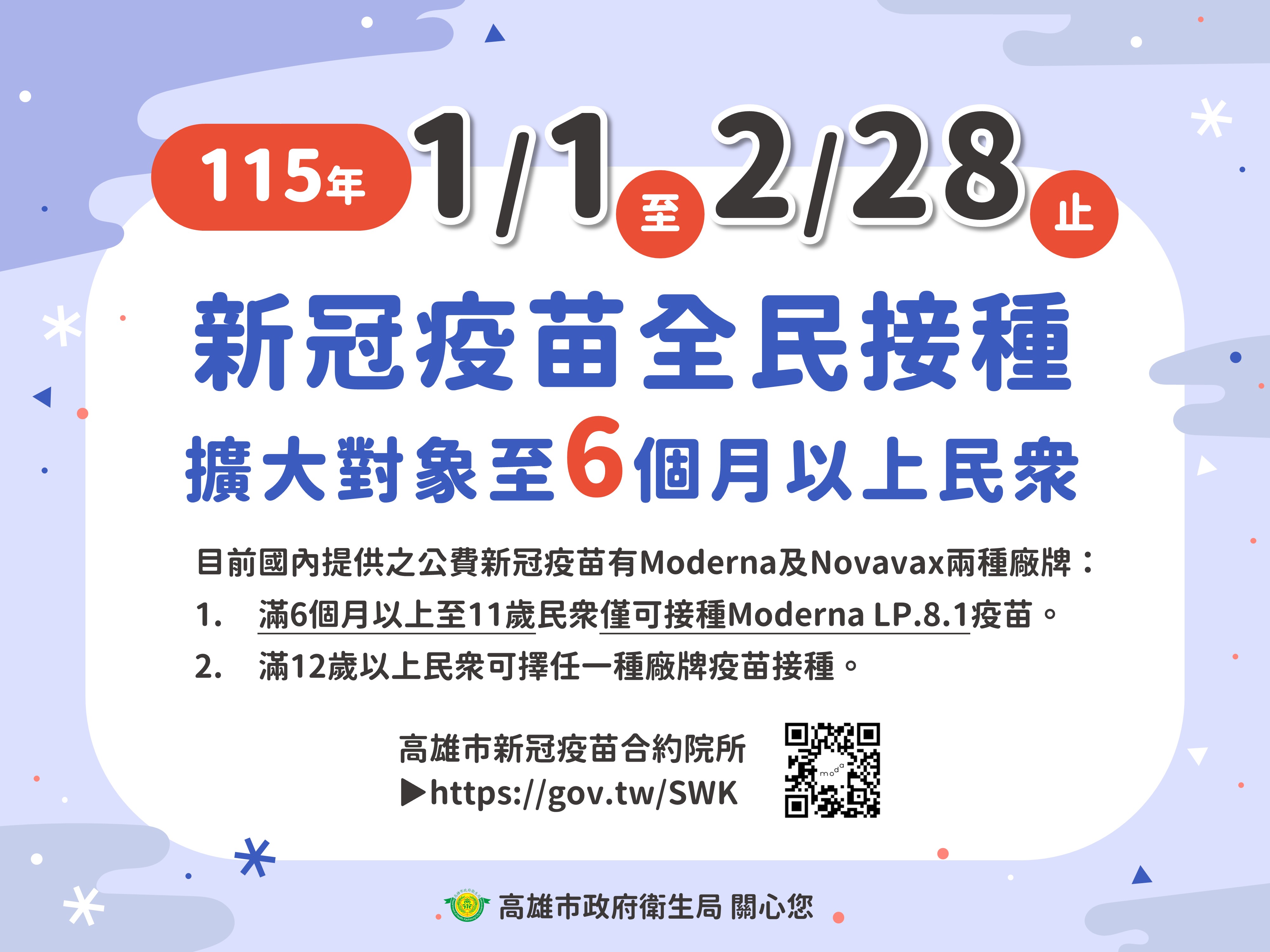 此外,根據衛生福利部疾病管制署政策,公費新冠疫苗自今年即日起至今2月28日止,擴大至滿6個月以上且尚未接種之民眾皆可接種本季公費莫德納 LP.8.1 疫苗及Novavax JN.1疫苗兩種廠牌。年滿12歲以上民眾可擇任一廠牌接種,滿6個月以上至11歲兒童則僅可接種莫德納疫苗,請尚未接種市民,攜老扶幼一同完成接種,及早建立免疫保護力。