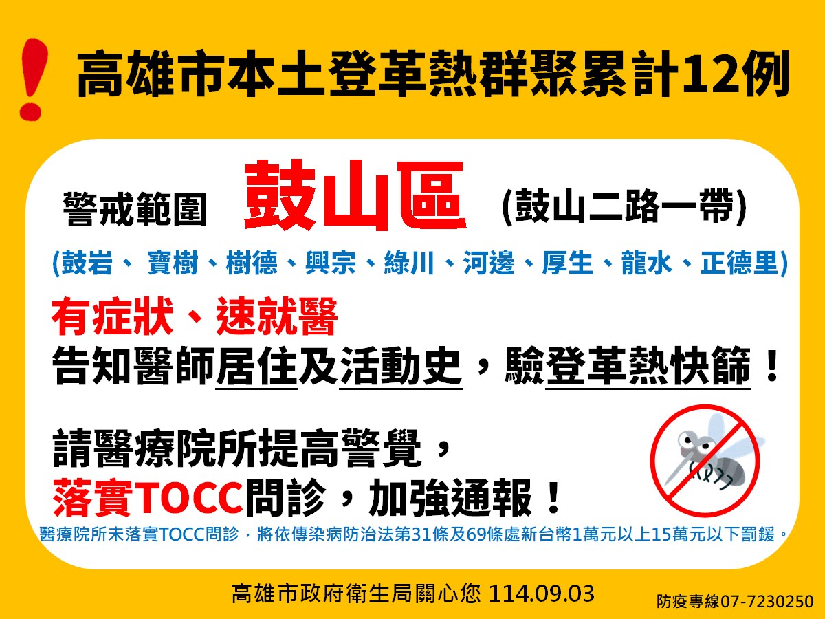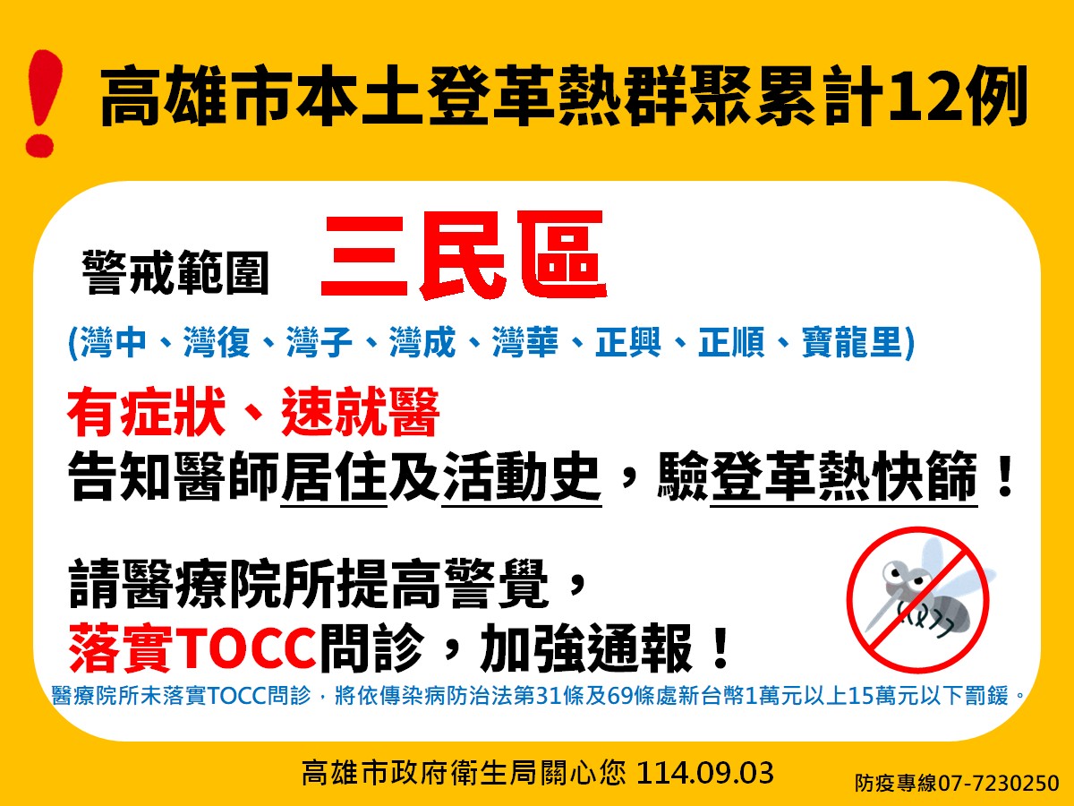 高雄市今(114)年登革熱疫情截至昨(2)日累計12例本土、14例境外確診個案,今(2)日未有新增。本土個案分布於鼓山區10例、三民區2例,共計5起家庭群聚,除3例個案為臨床醫師警覺採檢並即時通報,其餘9例均於擴大採檢主動發現。目前兩行政區確診者檢驗皆為第二型,經疾病管制署實驗室基因定序發現三民區確診案與本土首例相同,此波三民區疫情為鼓山區傳播鏈延伸。衛生局說明,有1例本土登革熱確診案例的工作地為國營事業,經本局執行確診個案工作地內部環境孳生源檢查時,發現該國營事業場域內查獲3處積水容器已孳生病媒蚊幼蟲,衛生局現場開單舉發,並責令清除髒亂及積水容器。衛生局提醒,三民區疫情警戒範圍內人口密集,疫情擴散風險高,民眾務必落實環境自主管理,清除孳生源、家中不養蚊。同時,衛生局呼籲,本市轄區內各權管機關,尤其是政府機關及國營事業更應該以身作則,善盡維護管理之責並依高雄市特定公私場所登革熱防制自主管理措施及查核辦法設置登革熱專責人員、訂定並執行登革熱防制自主管理計畫,應每週定期實施場所內環境自主檢查,避免容器積水孳生病媒蚊,不應等到登革熱疫情發生時才進行孳生源清除。 市府防疫團隊自本土首例群聚疫情發生,持續進行擴大疫調採檢、地毯式孳生源清除、噴藥滅蚊與環境整頓。其中鼓山區已於當地家戶周邊清查出1,133個積水容器,其中353個已孳生病媒蚊幼蟲,並捕獲142隻斑蚊,警戒範圍9里合計施掛154盞防疫捕蚊燈,昨日仍捕獲21隻成蚊,顯見當地仍有髒亂點及孳生源未完全清除,市府防疫團隊持續針對列管髒亂點加強環境整頓,並監測成蚊密度至警戒期結束。 此外為防堵三民區本土家庭群聚疫情,針對當地不少家戶長期於門前、屋前及屋後巷弄間堆置雜物及易積水容器,層層堆疊,雨後積水易成為病媒蚊孳生溫床,增加病毒在社區傳播風險,衛生局持續執行強制孳生源清除與噴藥等緊急防治,預計一週內完成2,000戶,呼籲市民朋友積極配合。 衛生局強調,清除孳生源是登革熱防治關鍵,只有全體市民主動積極清除家戶室內外積水容器,才能有效遏止疫情快速擴散蔓延。此外亦提醒居住或近期進出鼓山區、三民區疫情發生地區的民眾,兩週內若出現發燒、頭痛、關節肌肉痛、皮膚出紅疹等登革熱疑似症狀,請儘速就醫,並告知醫師TOCC(旅遊史、職業史、接觸史、群聚史),以利及早診斷 。 衛生局另呼籲前往東南亞等登革熱流行地區務必做好防蚊措施,穿著淺色長袖衣褲、於皮膚裸露處塗抹政府核准含DEET或Picaridin防蚊液,返國後如有不適儘速前往登革熱整合式醫療合約院所(https://gov.tw/1g1)就醫,主動告知醫師以利醫療院所提高警覺,善用登革熱NS1快篩輔助診斷和及早通報,共同防堵疫情擴散及完善防疫工作。市府防疫團隊持續進行孳生源清除、噴藥滅蚊與環境整頓市府防疫團隊持續進行孳生源清除、噴藥滅蚊與環境整頓