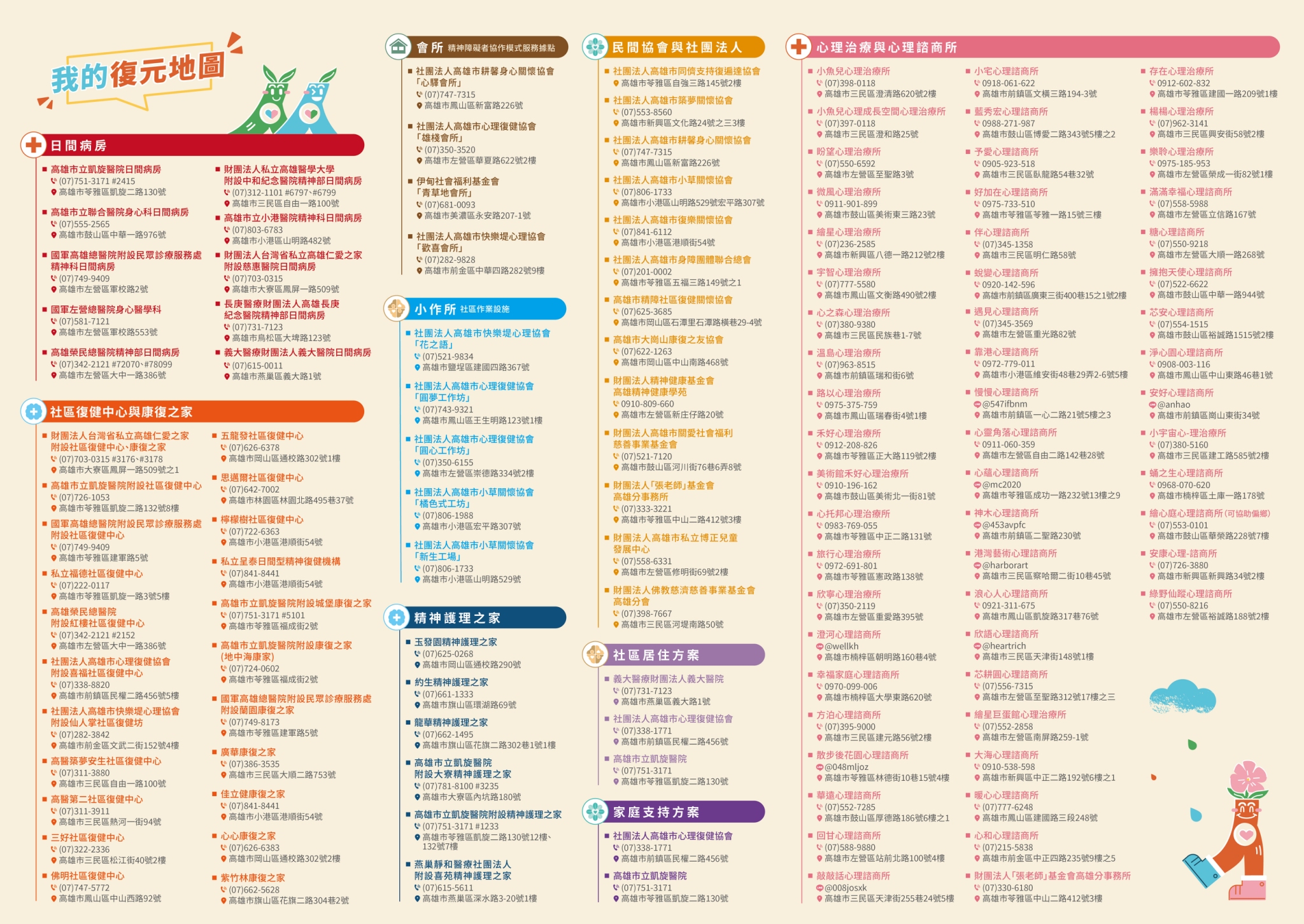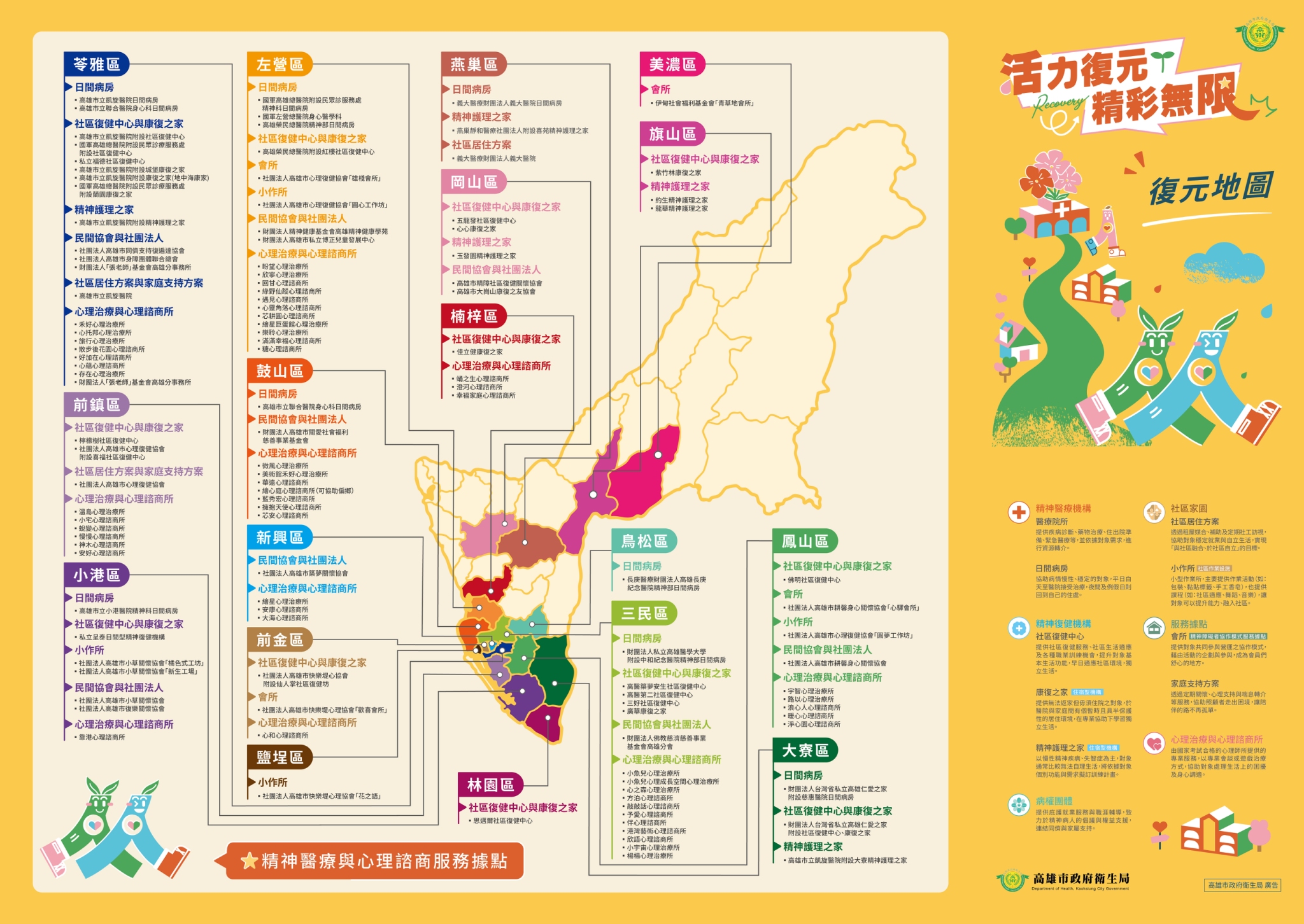 為協助精神康復者及其家屬在病情穩定後,能更順利銜接社區生活與支持服務,高雄市政府衛生局持續整合全市心理健康資源,建置「精神復元地圖」,將精神醫療、精神復健、社區家園及病權團體等資訊一次整合,讓民眾能快速查詢住家周邊可使用的資源,在需要協助時不再感到徬徨無助。