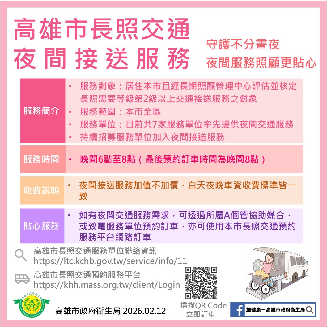 為提供長照個案更便利且完整的就醫交通服務,今(115)年度高雄市政府衛生局輔導7家車隊擴大長照夜間交通接送服務,除原有的白天時段的就醫交通接送外,亦將最晚訂車服務時間延長至夜間8時,服務範圍涵蓋全高雄市38區,貼心滿足長照個案日間及夜間就醫、復健、洗腎往返住家的交通接送服務需求。