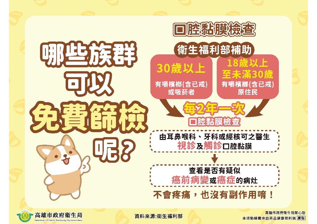 衛生局再次提醒,政府目前免費提供30歲(含)以上或18歲以上至未滿30歲嚼檳榔(含已戒)或吸菸民眾,每2年1次口腔黏膜檢查,符合免費篩檢資格的民眾,請帶健保卡到合約醫療院所接受口腔黏膜檢查,確保遠離口腔癌威脅。