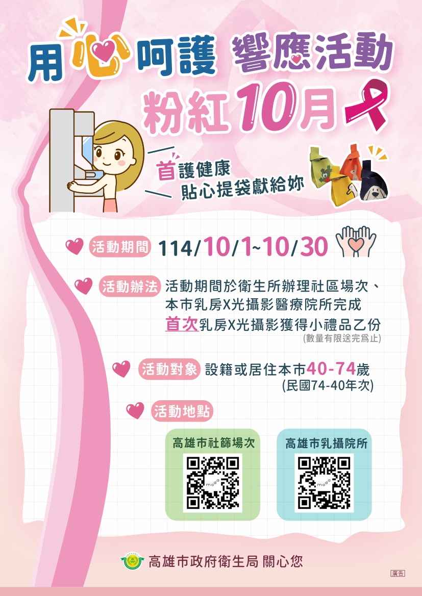 為喚起社會大眾重視乳癌威脅,鼓勵女性定期進行乳房X光攝影檢查,以達早期發現、早期治療,降低死亡風險目的,配合每年十月國際乳癌關注月,高雄市政府衛生局即日起至10月30日規劃「用『心』呵護、響應粉紅10月」乳癌社區篩檢與防癌宣導活動,只要居住在高雄市40至74歲女性,首次參加乳房X光攝影檢查,即可獲限量實用提袋一只,此外參加社區篩檢完成乳房攝影,亦有機會獲神秘禮物、登錄抽獎。